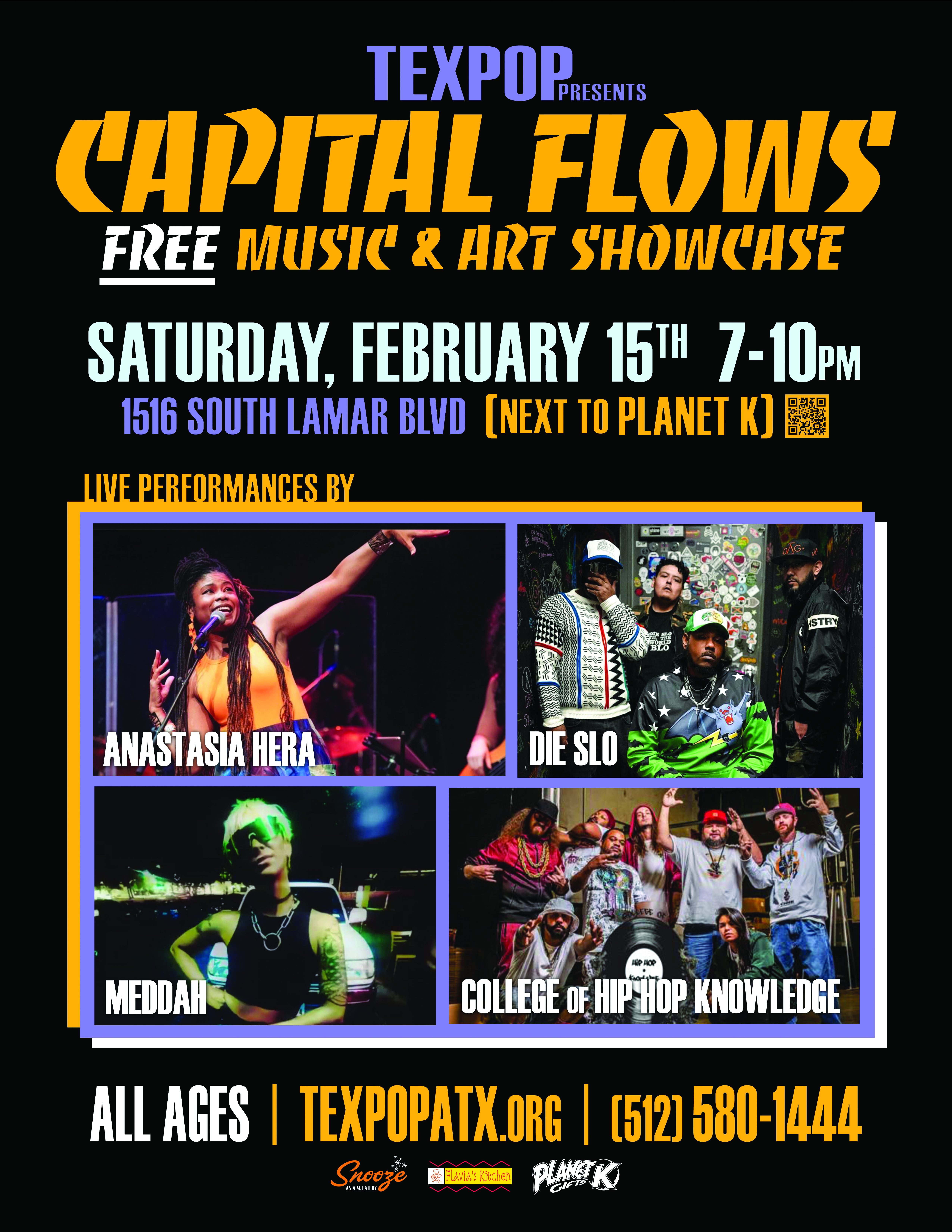 TexPop ATX is a museum of popular culture in Austin that features art exhibitions, hosts events for local artists and musicians, and preserves historic live music posters and memorabilia. We seek to enrich a growing and changing community by educating people about the unique culture of Austin’s past while bridging the gap between former and future generations of local creatives.